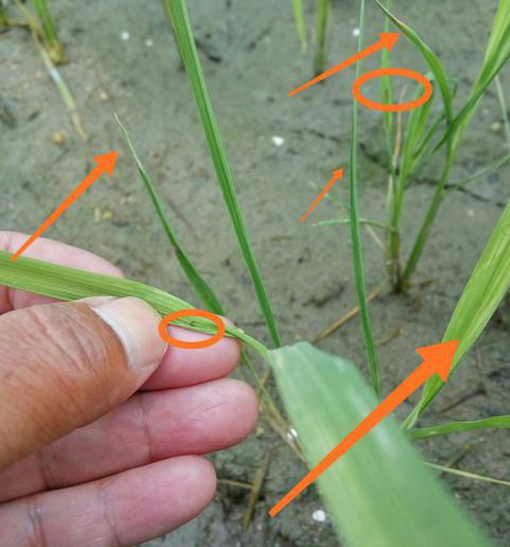 3.3、加強田間調(diào)查,對達到防治標準的田塊及時噴藥進行防治:在苗期,用沾水的手掌在秧苗葉片上來回掃幾次,一平方尺內(nèi)粘有5頭蟲或有5%以上的葉尖初卷;在大田分蘗期葉尖初卷率達10%并查到一定的活蟲時,都應(yīng)及時噴藥進行防治;