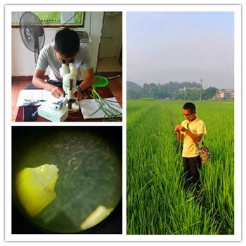 七月,在知了陣陣歡快地叫聲中,天氣一天天熱起來(lái),夏天的味道愈發(fā)濃烈了。這是一年中最為繁忙的時(shí)候,邵懷基地的隆平生產(chǎn)人奔走在田間地頭,量田、繪圖、看花期、除雜、查看“920”噴施效果、趕粉,忙得不亦樂(lè)乎! 七月的田間,到處都是一片生機(jī)勃勃的景象,那排列整齊的稻苗就像訓(xùn)練有素的士兵,放眼望去蔚為壯觀!生產(chǎn)人手持GPS行走在田埂上,盡管天氣酷熱難耐,道路崎嶇不平,但大家沒(méi)有半句怨言,步伐堅(jiān)定。頭頂藍(lán)天白云,遠(yuǎn)處翠綠的高山格外迷人,身旁不時(shí)有青蛙跳過(guò),發(fā)出呱呱的叫聲,給原本平淡的工作增添了些許樂(lè)趣。運(yùn)氣好的時(shí)候在田里還能撿到鴨蛋,這就算得上是意外的驚喜了。量完田后,借助繪圖軟件及時(shí)繪圖,為后期的隔離檢查做好準(zhǔn)備。 七月初,綏寧兩系組合陸續(xù)進(jìn)入幼穗分化,隆平生產(chǎn)人正忙著查看花期。分組合、分批次、分地點(diǎn)取樣后,借助細(xì)細(xì)的針頭在解剖鏡下一層層剝開(kāi)幼葉,當(dāng)幼穗出現(xiàn)的時(shí)候,我們總是興奮不已。剝檢分析讓我們心中大安:今年又將是一個(gè)豐收年。 七月的武岡,三系組合制種田里一派熱火朝天的景象,除雜工作正在進(jìn)行。除雜對(duì)保障種子純度至關(guān)重要,除雜前,我們耐心地給工人們講解雜株的類(lèi)型、識(shí)別方法、如何高效地除雜。當(dāng)下田時(shí),我們也不敢有絲毫懈怠,緊跟其后,對(duì)遺漏的雜株及時(shí)清理,并提醒大家再看得仔細(xì)些,確保清除到位。經(jīng)過(guò)連續(xù)一個(gè)星期的奮戰(zhàn),我們終于將雜株消滅干凈。 除雜的時(shí)候,噴施“920”也在同步進(jìn)行。噴施完“920”的田塊,稻穗從葉子里爭(zhēng)先恐后地冒出來(lái),短短幾天就全部集結(jié)到位。天氣晴好的日子,上午10點(diǎn)過(guò)后,芝麻粒大小的花粉陸續(xù)從谷殼里冒出,不一會(huì)兒就聚成一團(tuán),顯得格外熱鬧,正午時(shí)花開(kāi)得最盛,空氣中彌漫著花粉的清香,深吸一口氣頓時(shí)讓人神清氣爽,這時(shí)也是趕粉的最佳時(shí)期。由于花粉存活的時(shí)間很短,水稻開(kāi)花后要及時(shí)趕粉,在陽(yáng)光正盛的時(shí)候,大家兩人一組拉著繩子的兩端,齊頭并進(jìn),把父本的花粉拉到母本柱頭上完成授粉。授完粉,再過(guò)十多天,田里的稻子就成熟了,我們將迎來(lái)一年的豐收,那也是隆平生產(chǎn)人一年中最幸福的時(shí)刻! 一路走來(lái),伴隨田里的水稻一點(diǎn)點(diǎn)地長(zhǎng)大:生根、發(fā)芽、開(kāi)花、結(jié)果,我們?cè)谶@個(gè)過(guò)程中不斷學(xué)習(xí)、成長(zhǎng),對(duì)制種事業(yè)的熱愛(ài)日漸濃厚,更加堅(jiān)定了未來(lái)的奮斗方向:在今后的生產(chǎn)工作中,隆平生產(chǎn)人將繼續(xù)發(fā)揚(yáng)腳踏實(shí)地的工作作風(fēng),不斷迎接新的挑戰(zhàn),開(kāi)創(chuàng)制種事業(yè)新輝煌!