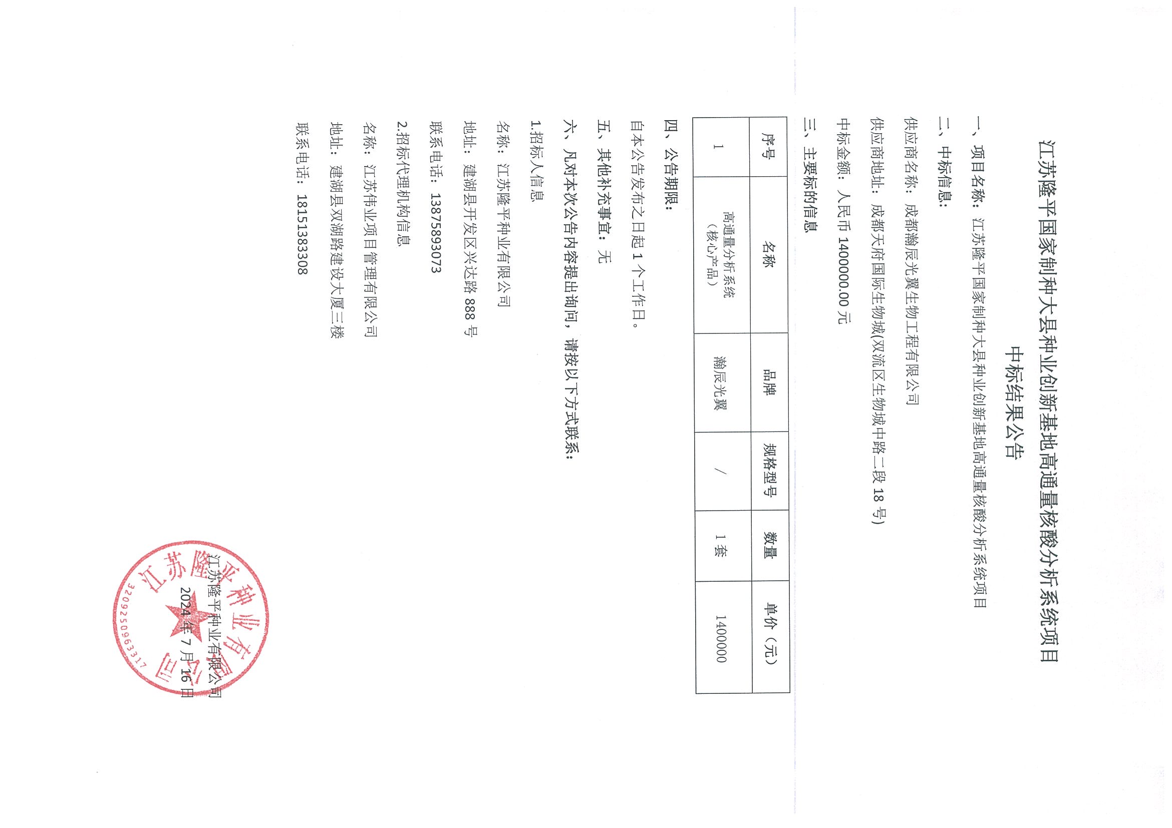 江蘇隆平國家制種大縣種業(yè)創(chuàng)新基地高通量核酸分析系統(tǒng)項目中標結果公告